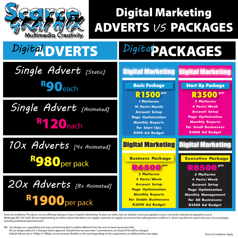 Ranging from Graphic Design, Website Design & Development, Website Hosting, Digital Marketing, Printing for the purpose of Signage and Advertising on matertial such as gloss or bond paper, vinyl, PVC, ContraVision, Wallpaper, Heatpress, Screenprinting, etc.